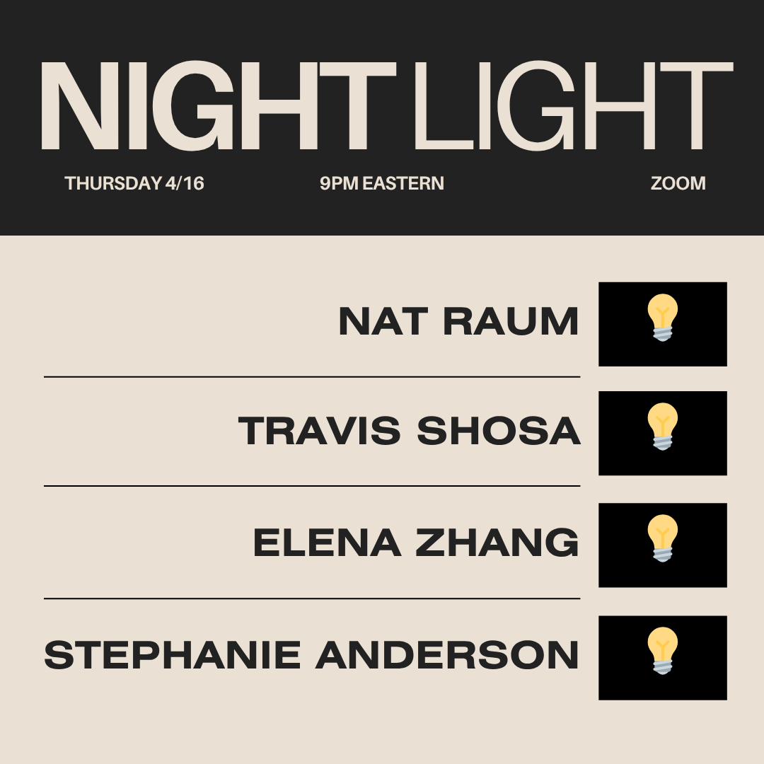 Catch me reading with some great griends @ Tom Snarsky's Night Light series next Thursday, 4/16, at 9:00 PM EST!! Register on Zoom here -- I'll be running in from an AFL-CIO meeting, but I'll def see you there :)